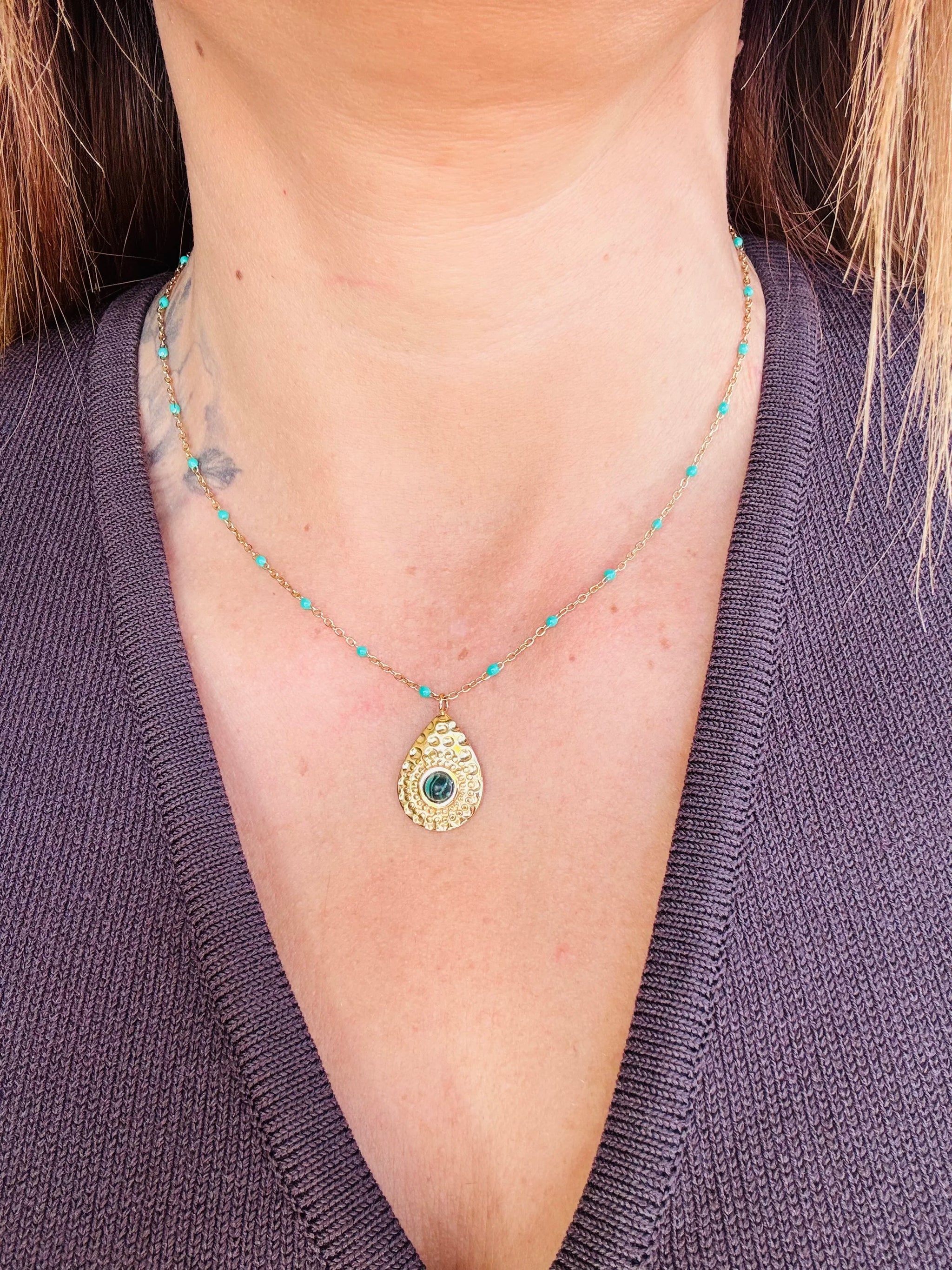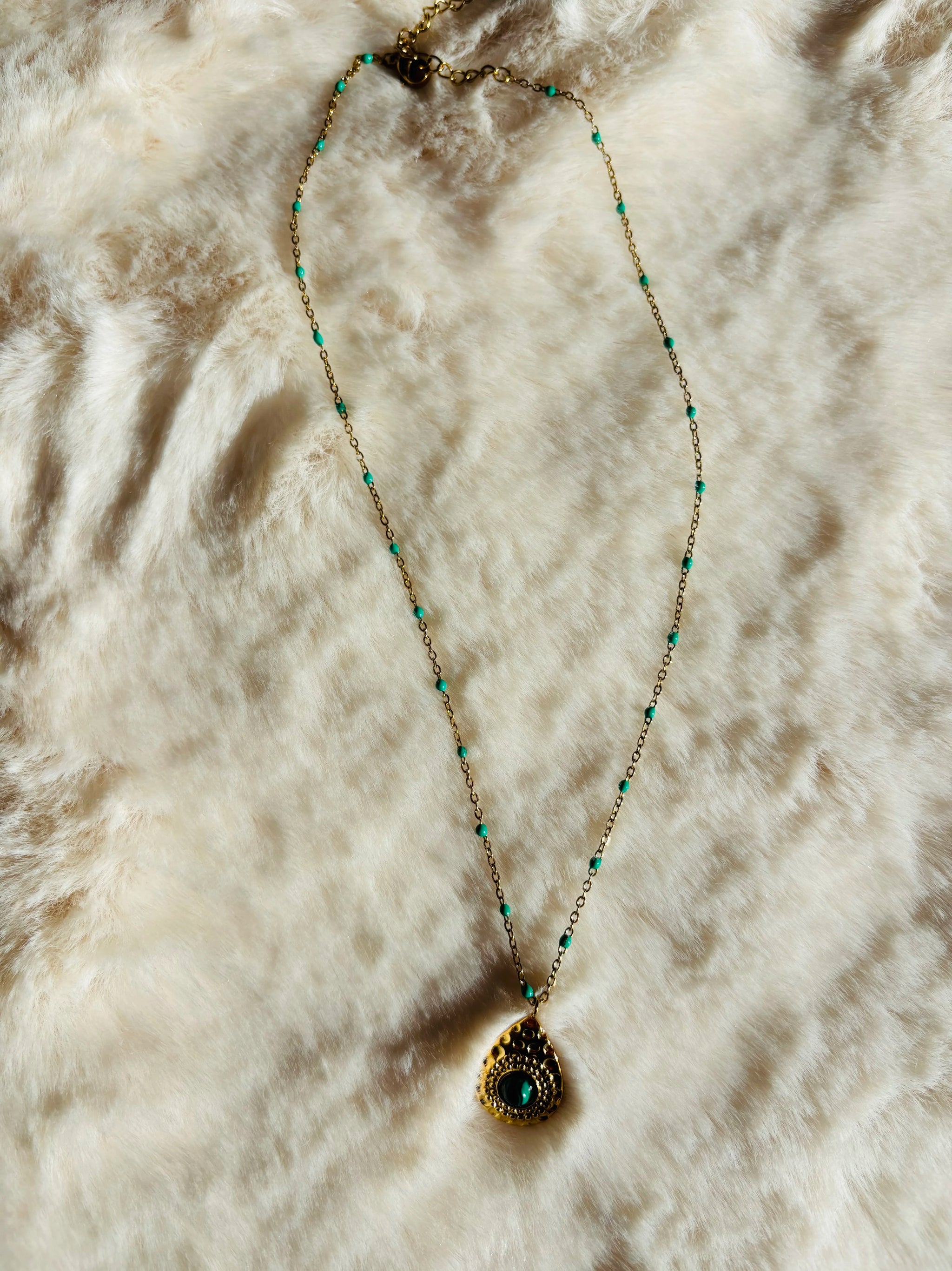 Sublimez votre style avec ce collier doré en acier inoxydable pour femme au pendentif en forme de goutte martelée. Son design unique associe l'éclat d'un pendentif doré à la fraîcheur de perles vertes, pour un rendu chic et intemporel. La pierre centrale verte ajoute une touche d'originalité qui attire tous les regards. Léger et élégant, il s'adapte à toutes vos tenues.