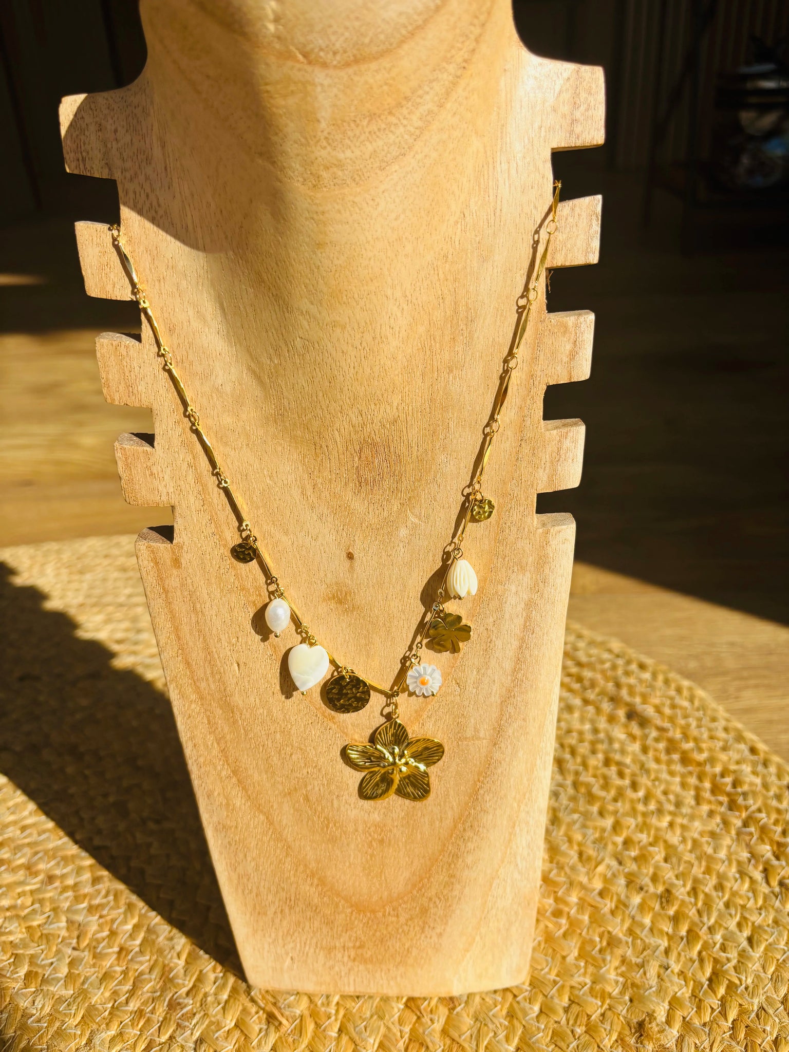 Laissez-vous séduire par ce collier charms raffiné qui mêle douceur et éclat. Orné d'une grand fleur dorée et de multiples pendentifs délicats (coeur nacré, trèfle porte-bonheur, perle, marguerite et médaillons texturés) , il apporte une touche de poésie et d'élégance à toutes vos tenues.